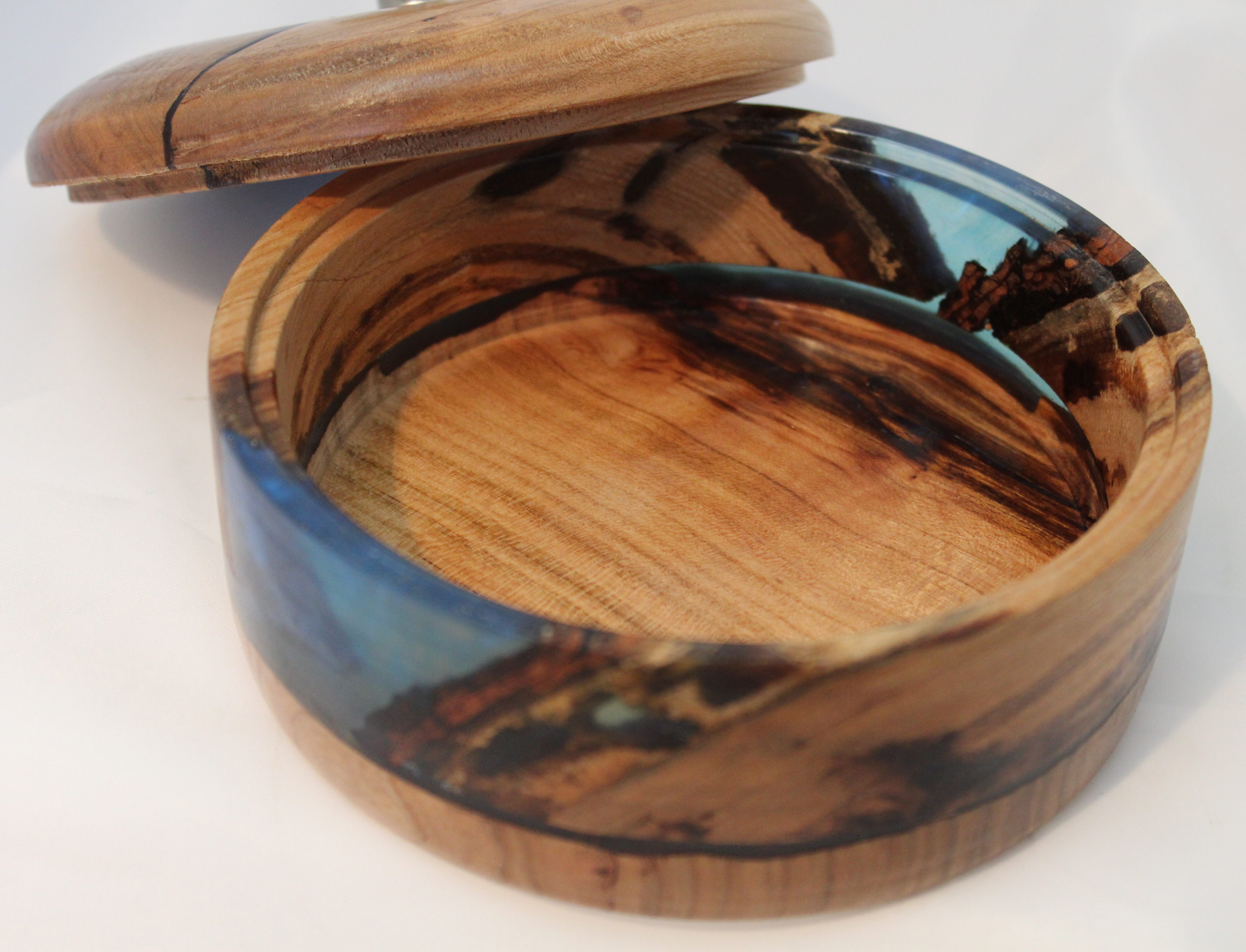 cherry and resin – inside Published on July 7, 2018 in Cherry and epoxy boxFull resolution (4510 × 3447) ← Previous Since the resin is transparent, when light goes through, it becomes a very pastel blue and you can seen all of the bark. Kinda cool!