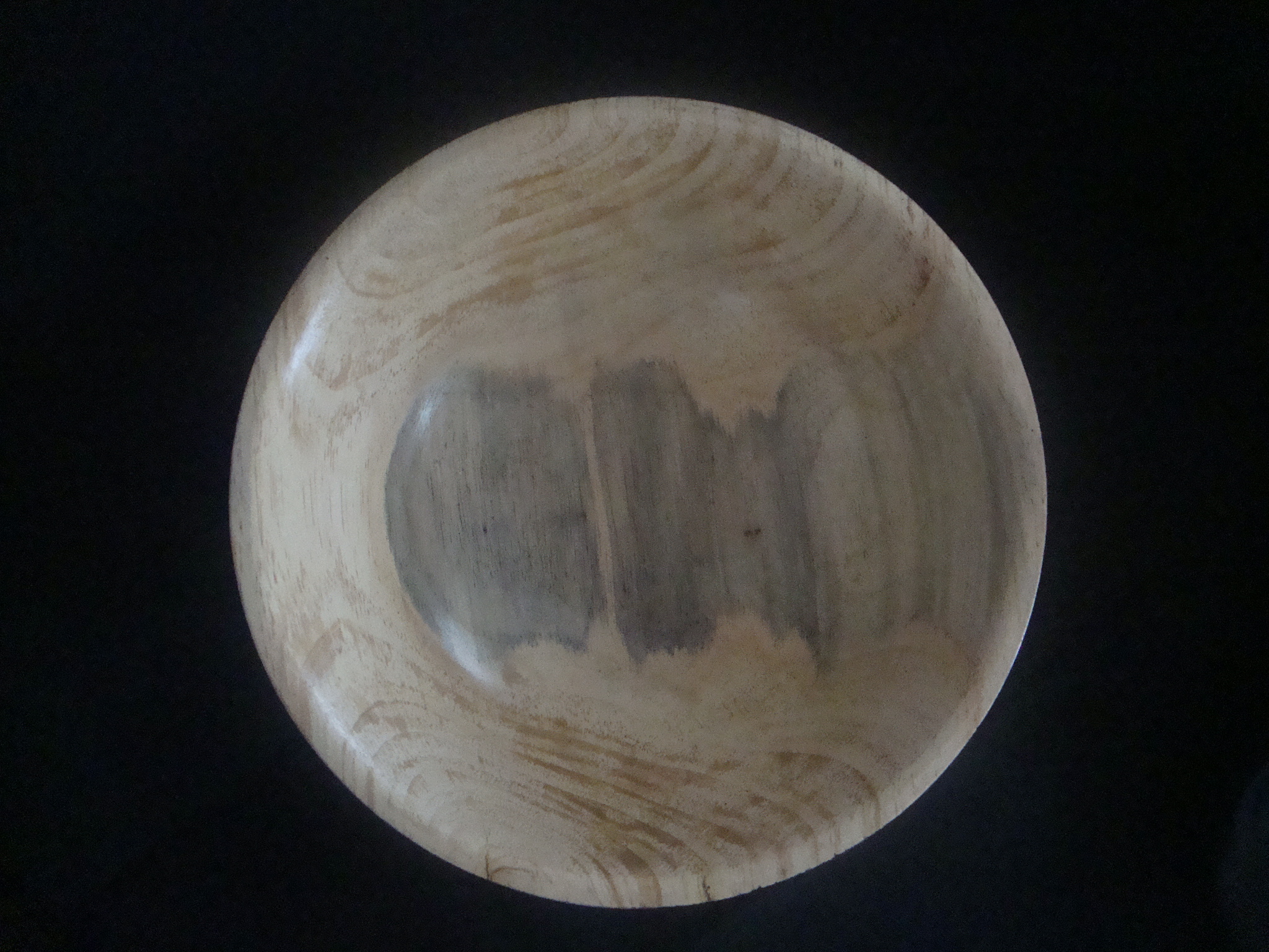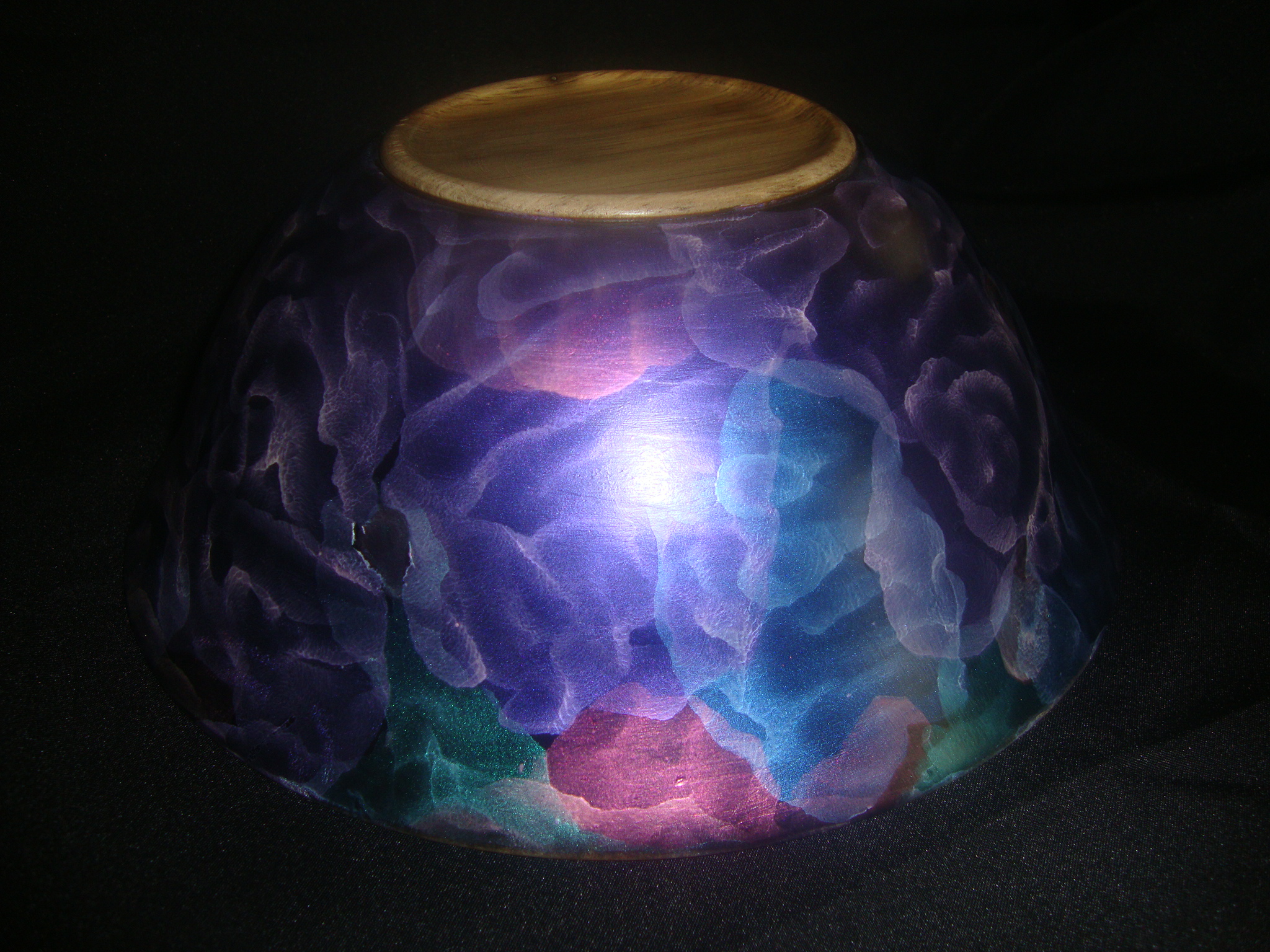 After a full afternoon of swearing, I managed to turn a bowl out of this stuff that really wasn’t that bad in terms of size and shape. The pine had discolored for some reason, so it was less bland than I had expected, especially on the inside of the bowl. Still, there were some rough spots on the outside of the bowl where the wood grain just refused to cooperate with the gouge, so I needed to do something to hide what I couldn’t correct. I decided to fill all of the tear outs with CA glue and sawdust, then sand it down to be smooth. Then, I painted the whole outside black to cover the patch job and applied the “cosmic cloud” colors. All things considered, this one turned out pretty good! I’m still getting the hang of the coloring process, but I think I’ve finally found something that makes the painful process of turning pine worth it.