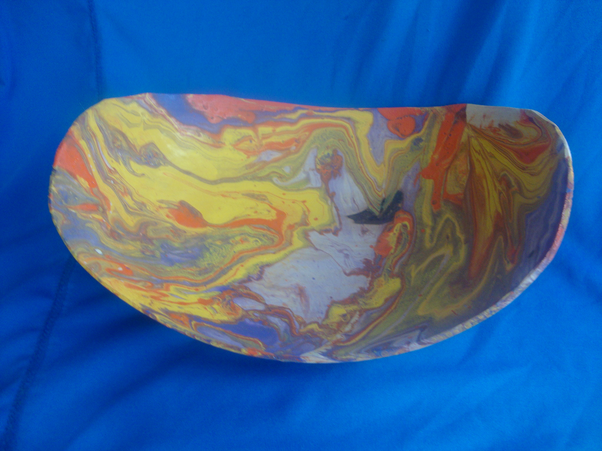 Earlier this month, I made a shallow dish, but thought it looked plain. To fix that little issue, I decided to try a paint dipping technique, courtesy of a couple thousand You Tube videos. If done right, it will make some really cool swirls on the item being dipped. If done wrong, it will make a gloppy, sticky mess! For a first attempt, there was much in the way of learning lessons to be taken away: