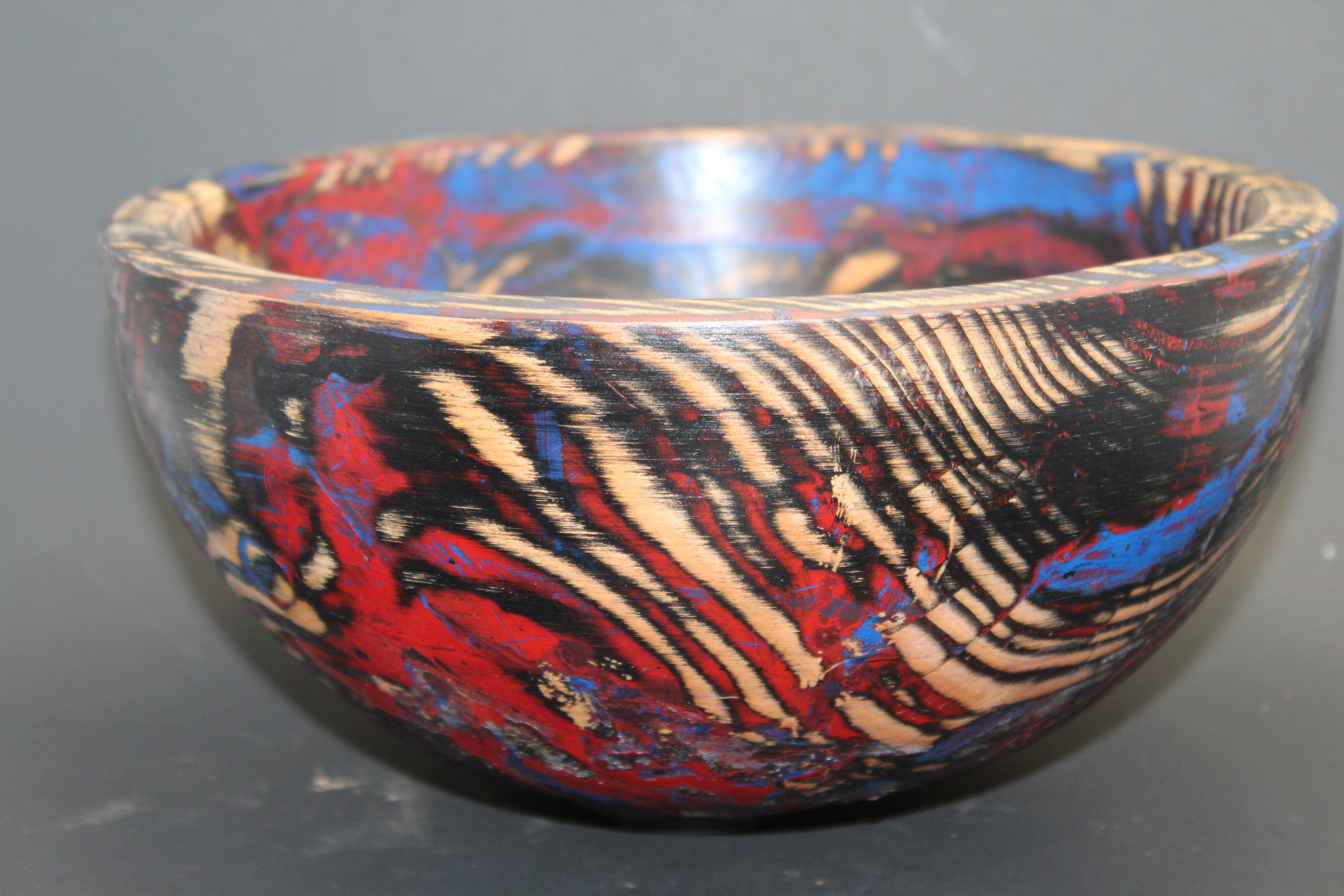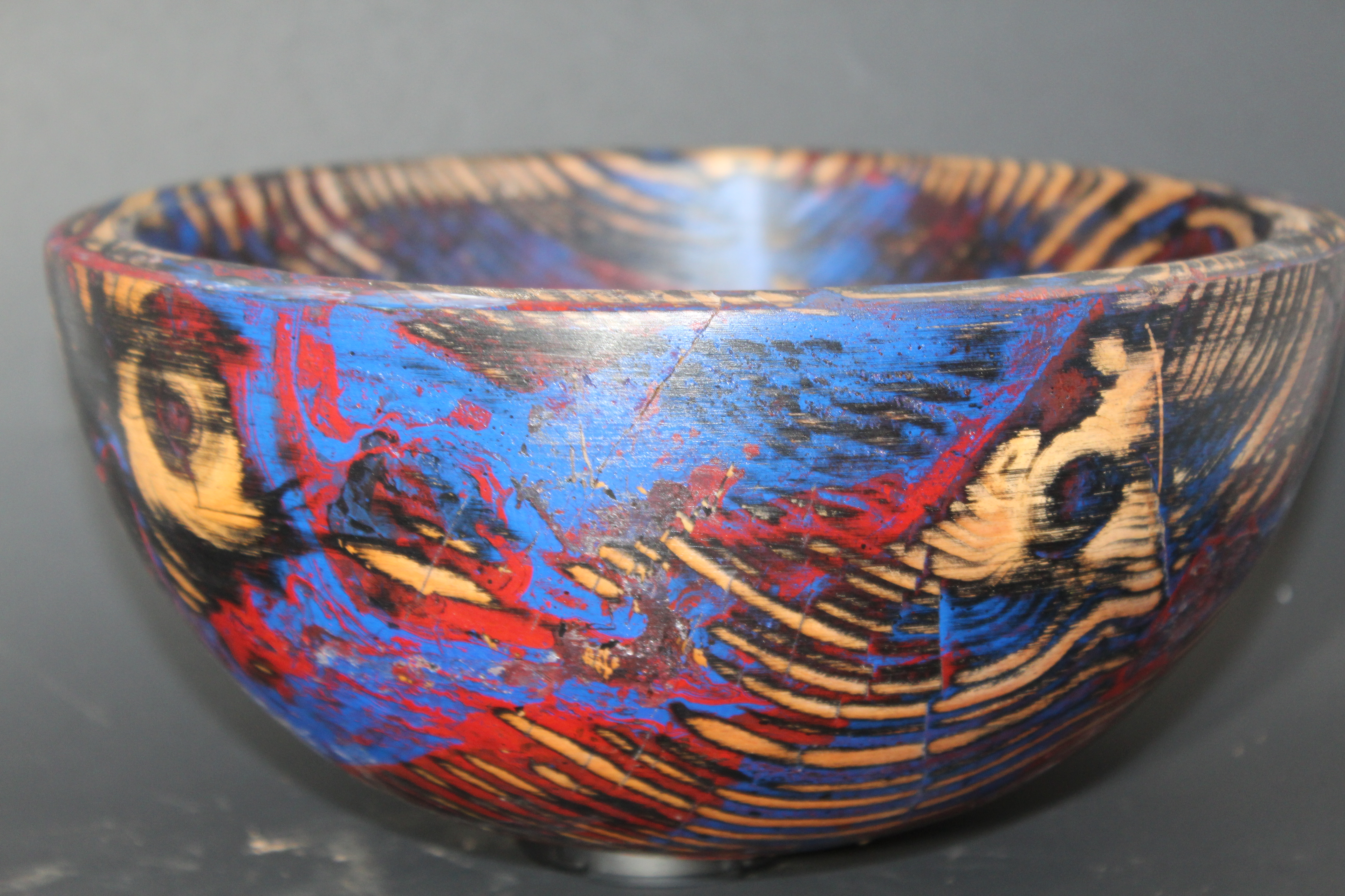This project was nothing but luck, both good and bad. I started with a crappy piece of pine that should have been firewood because if had a huge knot right in the middle of it. Bad luck. When I turned the basic shape and took out the middle, somehow the knot was completely turned away. Good luck. When I started to do the painting, I put a flat coat of black spray paint on the whole thing, then dipped it in two different shades of blue, some red, and a little bit of the metallic. (One of my daughters saw it drying and said, “That looks like Spiderman”. As soon as she said it, I realized how right she was, hence the name.) Being pine and being dipped in water, as the bowl dried, it started to crack and the grain suddenly became very uneven. Bad luck. It also had the globs on the side from where the metallic paint failed to mix with the regular spray paint. More bad luck. I figured the only thing I could do was put it back on the lathe, turn off all the paint, get it back into round, then try the whole dipping thing again. About 30 seconds into sanding the paint off, I stopped the lathe because there was a weird color starting to come out. The grain that had raised by the water had been sanded bare, but the other parts of the bowl still had the dipped color. The effect of this happy accident was a really cool variation in the colors! Very good luck! All that was left was to finish the bottom of the bowl, which should have take about 5 minutes. 4:59 seconds into the process, the bowl came loose from the lathe and started banging around at a very high rate of speed. I was left with a smudge in the paint on one side and a series of holes near the base on the other side that looks like a rabid woodpecker went on a rampage. Bad luck…