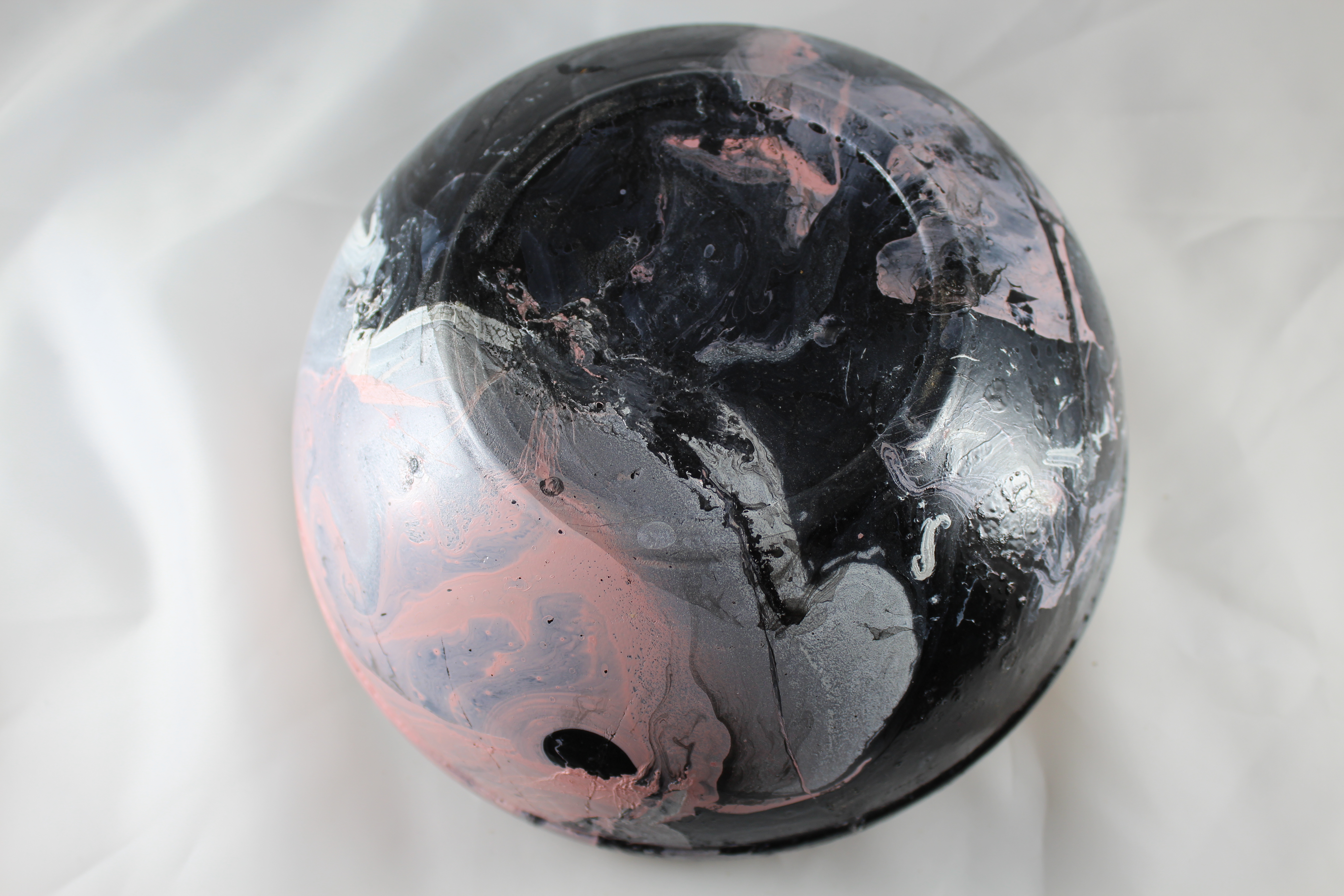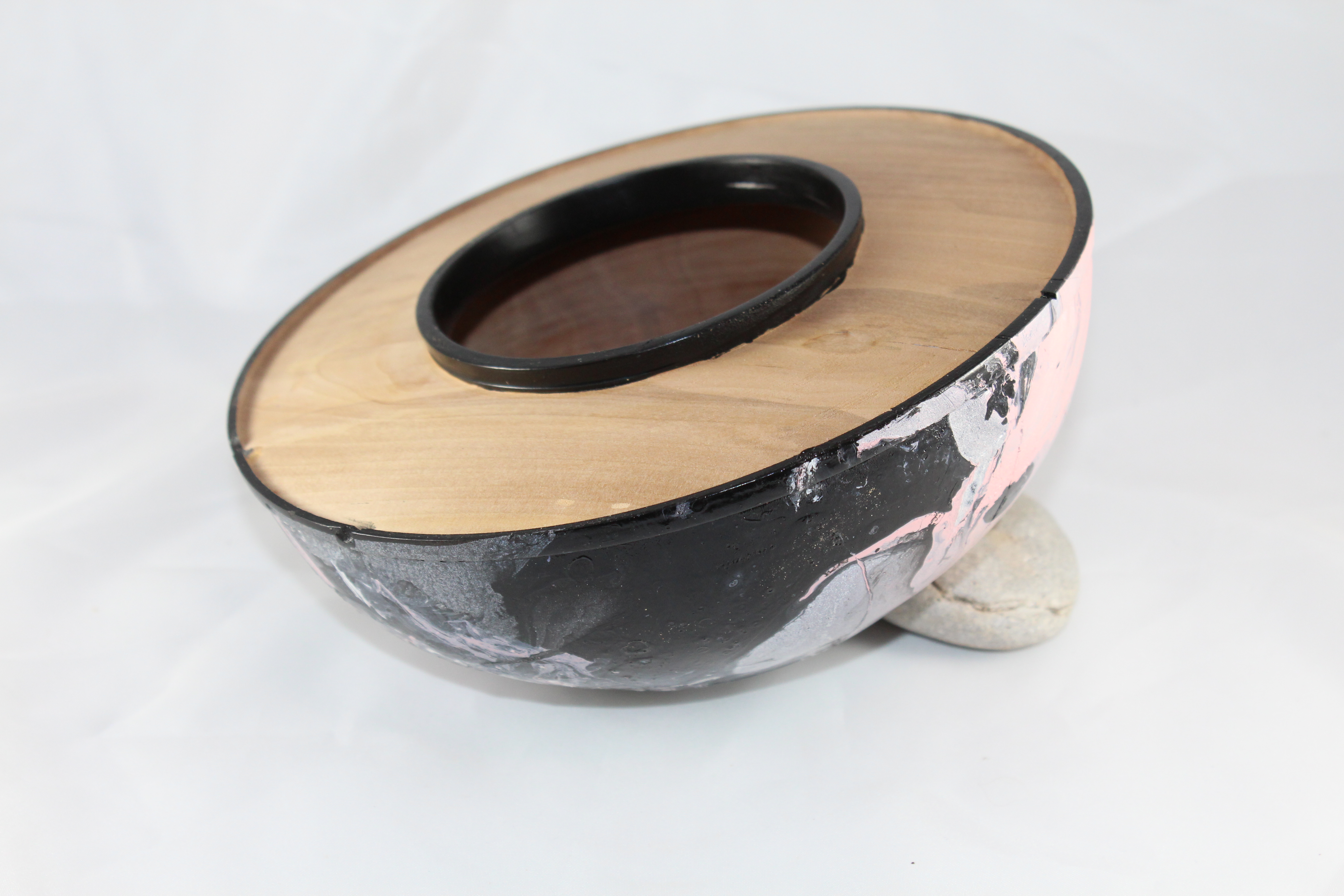 To use the stuff, there had to be a surface where the paint could puddle. I made this bowl, but left a wide, flat rim, with a channel around it to hold the paint. Since the wood was pretty ugly and had a couple of huge cracks in the side, I spray painted the outside, then dipped it in pink, white, silver, and black paint, thinking that would go well with the “bio-culture paint” that I was putting on the rim. If I was wrong, I could always put it back on the lathe and take the paint away.