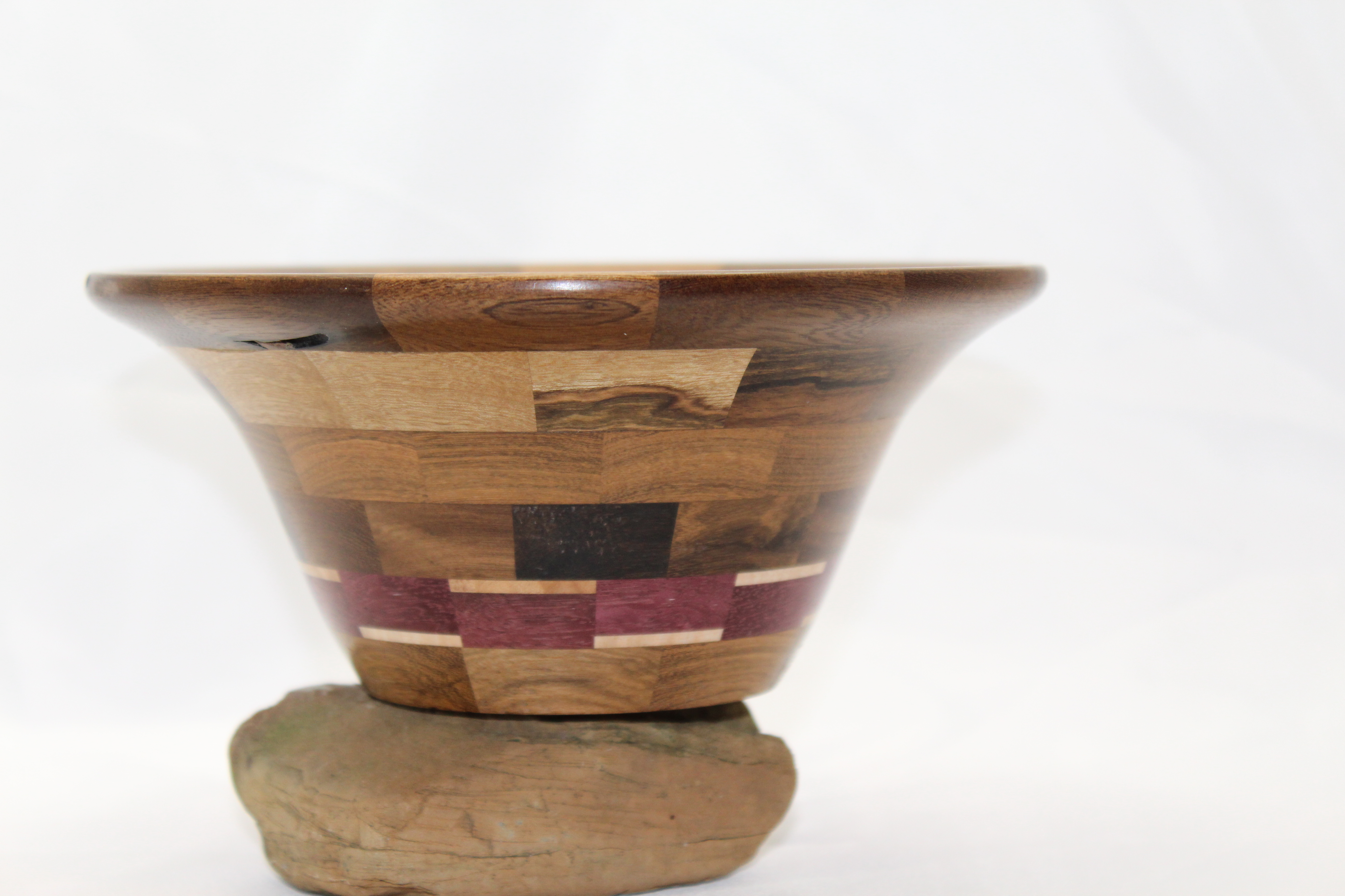 I finally got around to finishing the second bowl. This one took awhile, because the bottom segmented ring didn’t come together in the middle, leaving a little jagged, round hole right in the center. I could either make another layer for the bottom of the bowl, or do something to patch the hole. Either work work, but neither felt like the right thing to do, so the half finished project set in the corner.