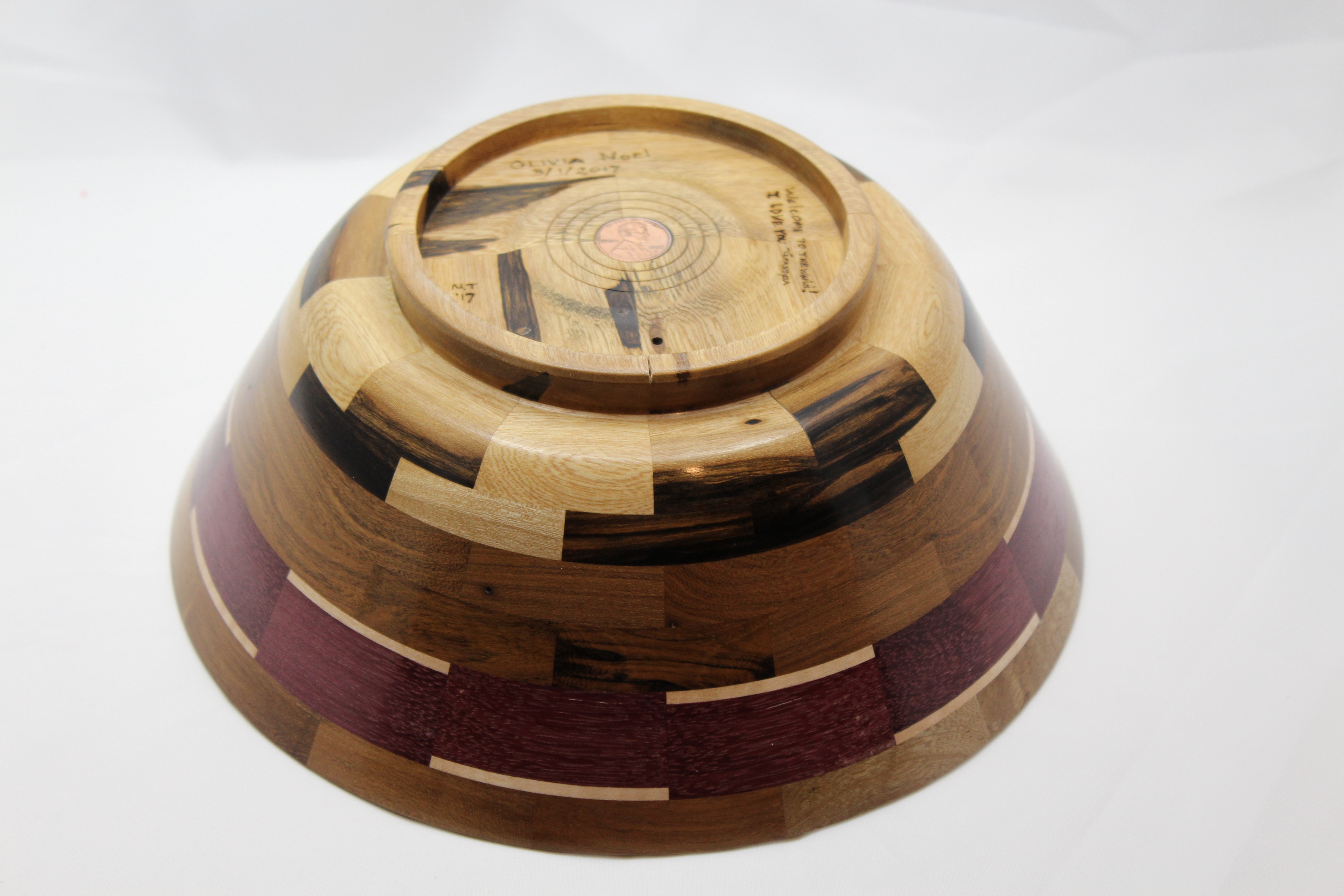This is the bowl I had in my mind when I started on the project to make my newest grand daughter a bowl. A combination of South American hardwoods, with some purpleheart added in for a feature ring, and a little maple to break up the pattern. The turning was easy, since the Brazilian mesquite and the weird variety of pecan turn really easy. Purpleheart is one of the hardest woods on the planet, so it took a little time.
