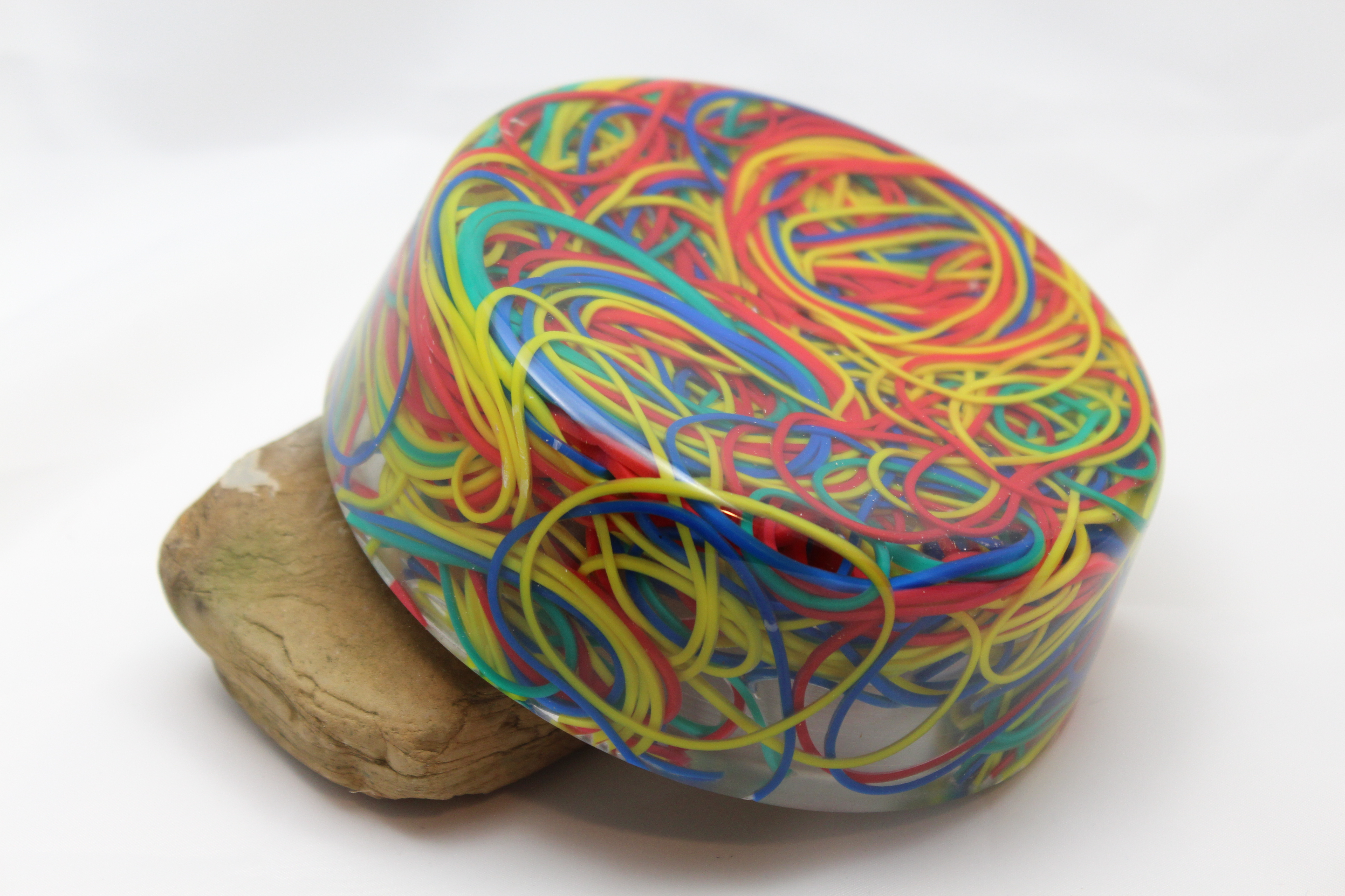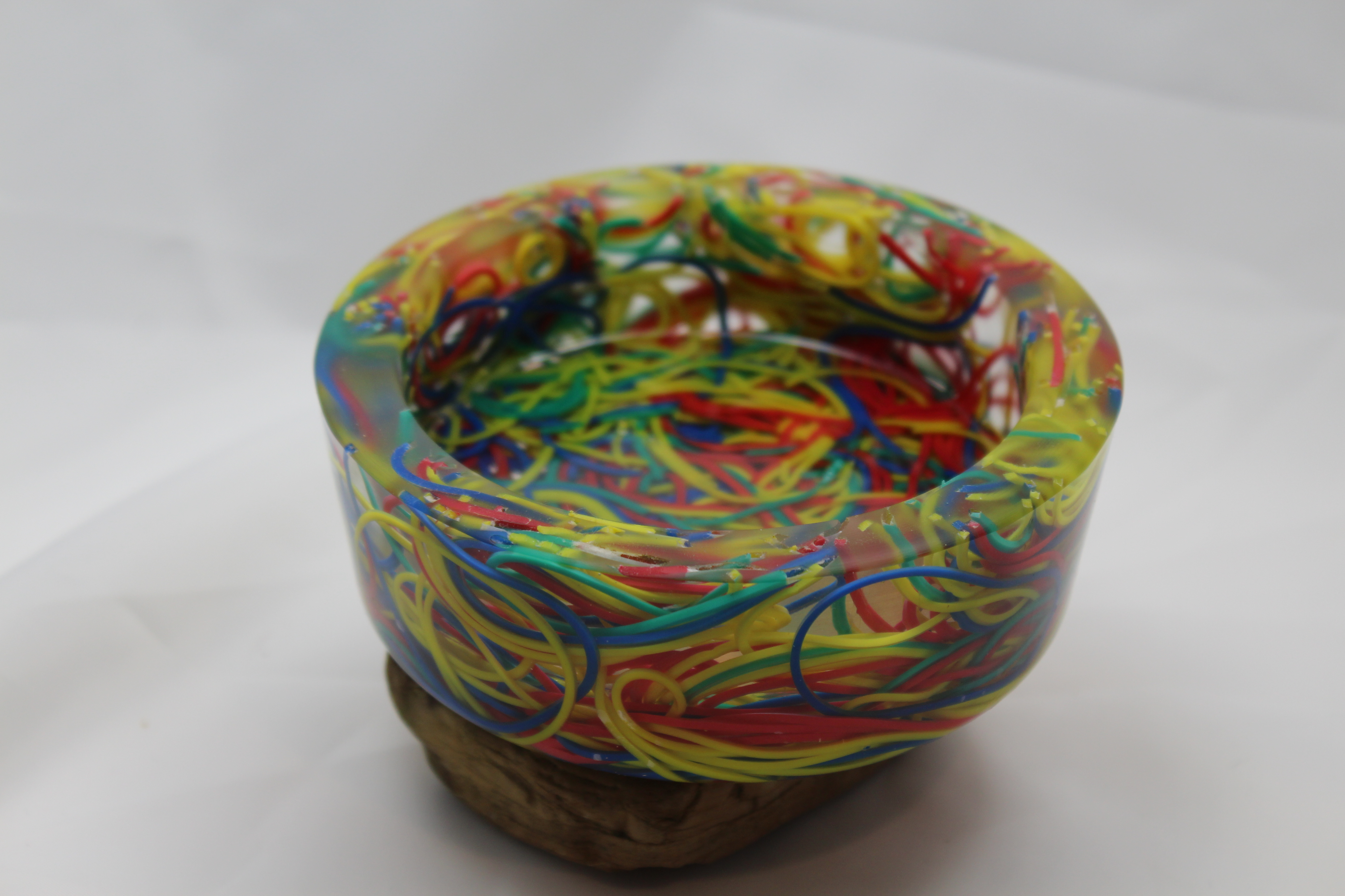 My secretary has been dropping not-so-subtle hints for the last three years or so that I haven’t made her anything. When I brought in the pencil holder, made of colored pencils, she really seemed to like it, so I figure I’d make something similar for her desk, but didn’t know what. My first thought was to find some non-metal paperclips and make her a little bowl to hold paper clips. What I found is that no one makes standard shaped paperclips out of anything BUT metal, so that idea was out. I saw a bag of colored rubber bands and thought that might work. What a mistake! Remember the old commercials about the Gillette double edged razors? The one with the graphic about how the first blade stretches the whisker out so the second one can cut it off, shorter? Well rubber bands encased in resin act much the same way. Or, they squish around the tool and don’t cut at all. Most annoying, were the ones that only cut a little bit, and then flapped around slapping everything as the lathe was spinning. The final product turned out ok, although I can’t say this is the best thing I’ve ever made.