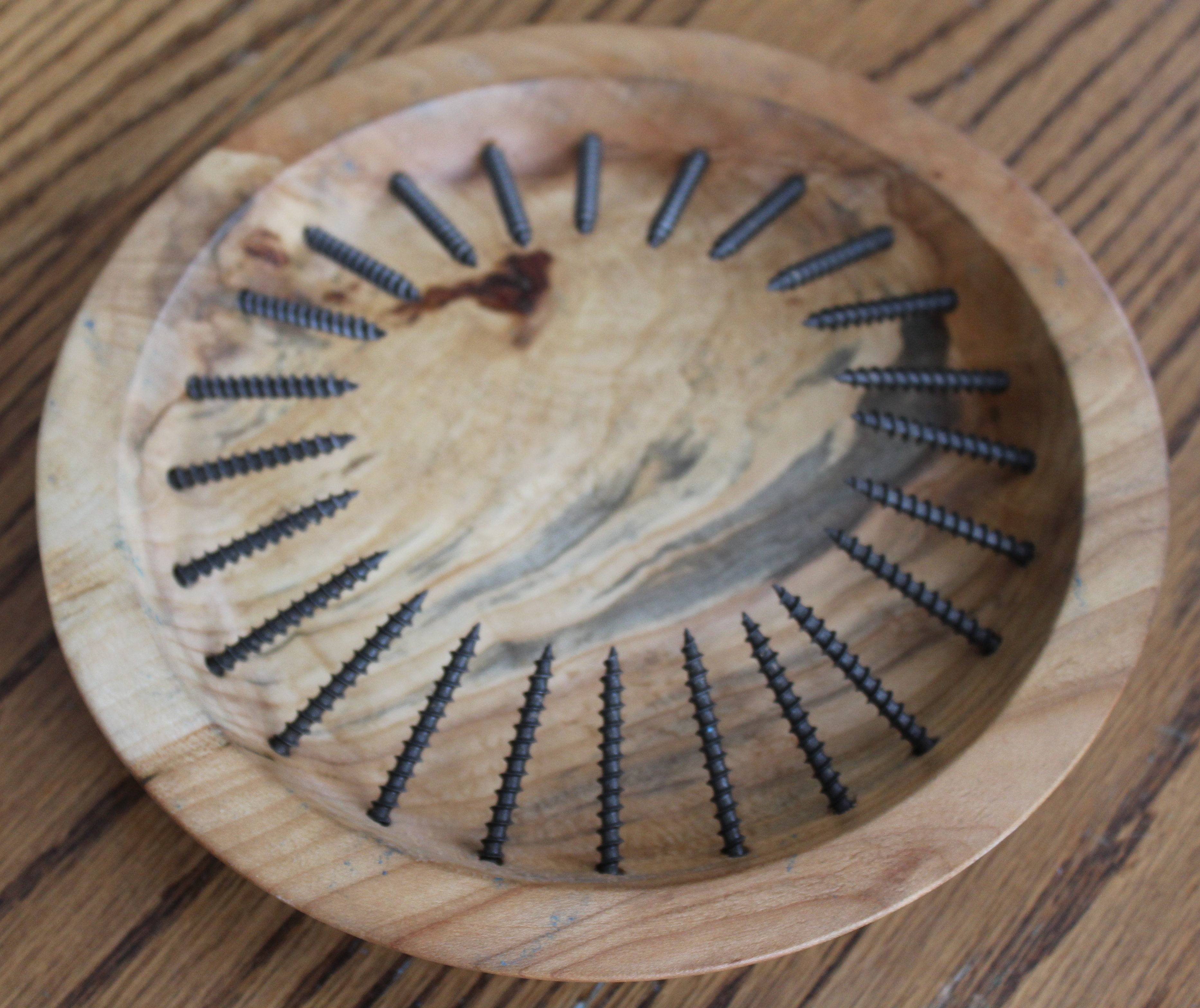 My woodturning club’s “president’s challenge” for May and June is to make something that uses screws, nails, or tacks. That’s a pretty wide range of possibilities, but I was having trouble trying to figure out something I could do that would be different. When I went into work last Monday, things got real clear, real quick.