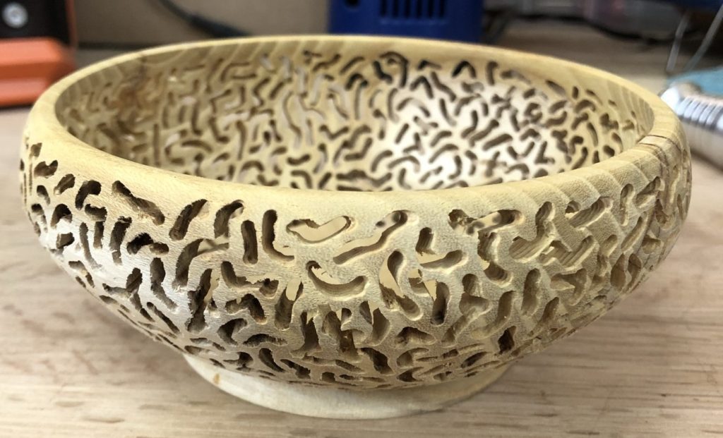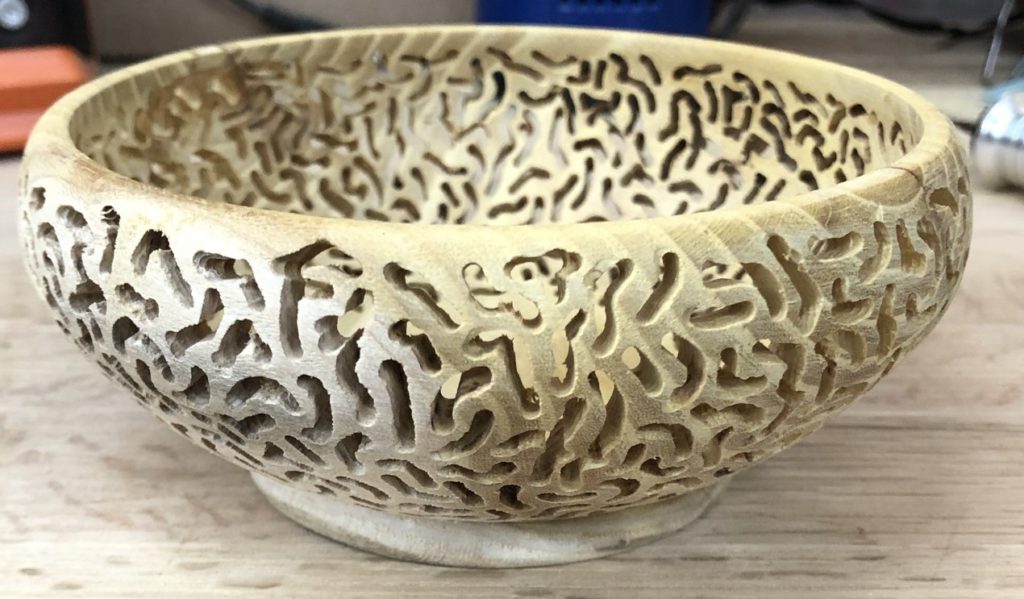 It looked too plain, so I put it back on the lathe and thinned it down so it could be pierced. After about 3-4 hours and some ibuprofen, I ended with this: