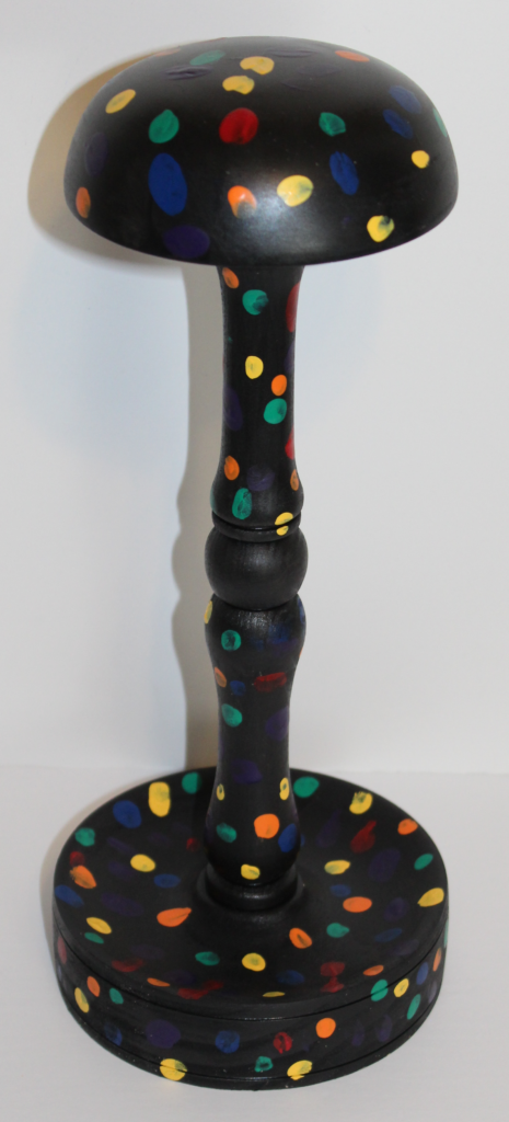 When I got done making the videos, I had three wig stands that were completely turned, but needed to be finished. For many, this means nothing more than applying a few coats of wipe on Poly, but the first two were very plain, bland, poplar. I’ve always thought that if someone going through cancer treatment needs a wig stand, the least we can do is make them something worth looking at. For the first one, I decided to use it as an “all day activity” with Papa, while I was babysitting one of my grand-daughters. She’s three, so her art skills are admittedly limited, but she actually followed instructions very well, took her time, and did an exceptional job!