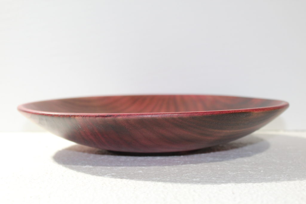 Looking at the shape I’d left when I roughed it, it was clear this was meant to be a shallow bowl. It only took about 45 minutes to get the turning done, even though it is about 1/8″ thick on the side walls. Surprisingly enough, the end grain wasn’t too chewed up, so the sanding went pretty quick, too! I was just about to take it off the lathe to remove the tenon, when I realized the reason it had been so easy to turn and sand is the grain was about as straight as could be. Not that there’s anything wrong with that, but to me, it just looked blah. Like vanilla ice cream kind of blah.