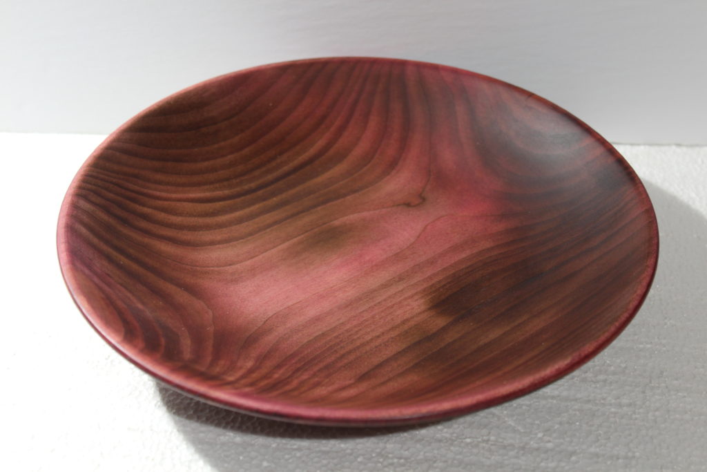 After coating the whole bowl, I let it dry while I mowed the yard. When I came back, the blank was a dry as it could be, so I was able t proceed. I sanded the bowl back using 240 grit paper, intending to leave just a little black remaining on the wood grain. Nice thought, but what I actually got was the entire bowl looking very dark. In all honesty, it looked surprisingly like walnut! . Next, I put on some red and liked the way it changed to color, without making it look too obvious. There’s still enough of color from both the burning and the black dye, that it didn’t come out a cartoon color. I decided it was as good as it was going to be, called it a day, and added three coats of lacquer.