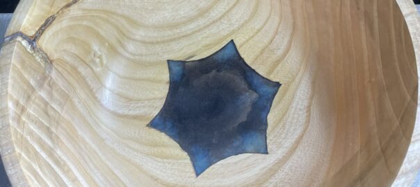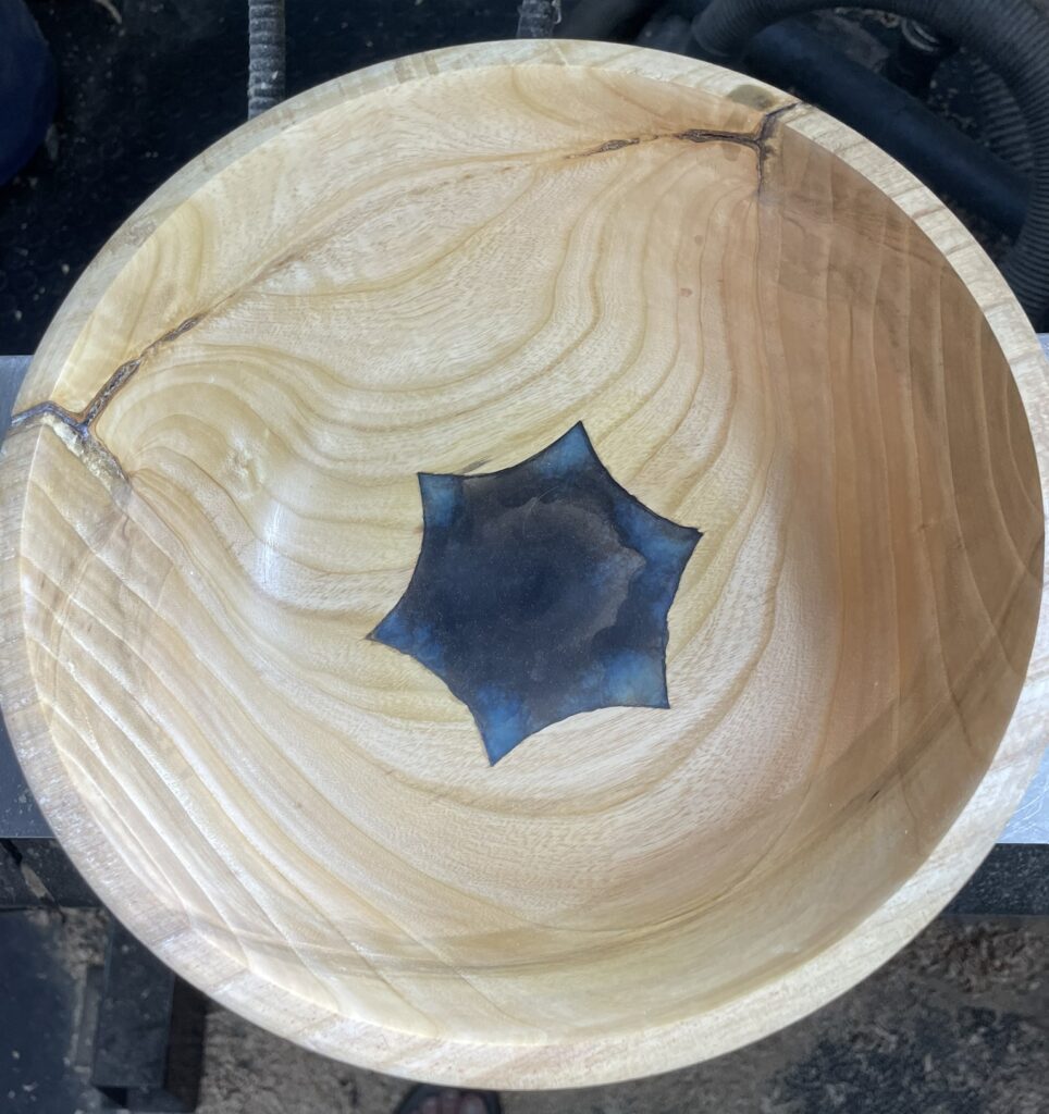 Bob’s fix was based on the premise that the hole would be enlarged until the thickness of the wood around the hole could accept what would become a new tenon made from contrasting wood. I decided to take a slightly different path. Since there’s no hole, there’s no turning to “prepare for the plug” and there’s no plug to turn. I figured I’d skip the who plug thing and fill the bowl’s divot with epoxy until the bottom thickness of the bowl was thick enough to turn. The result would be a small circle of epoxy in the bottom or the bowl. The more I thought about it, I realized I could drop the whole concept of leaving a circle, since the only important part was how thick the patch was.