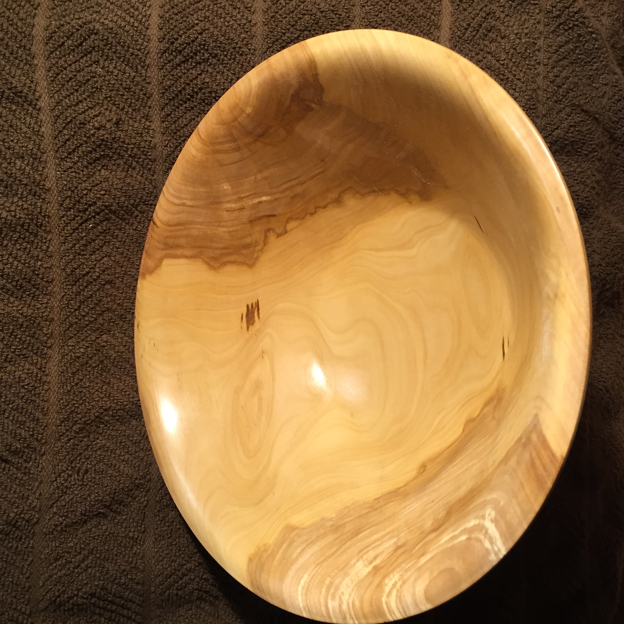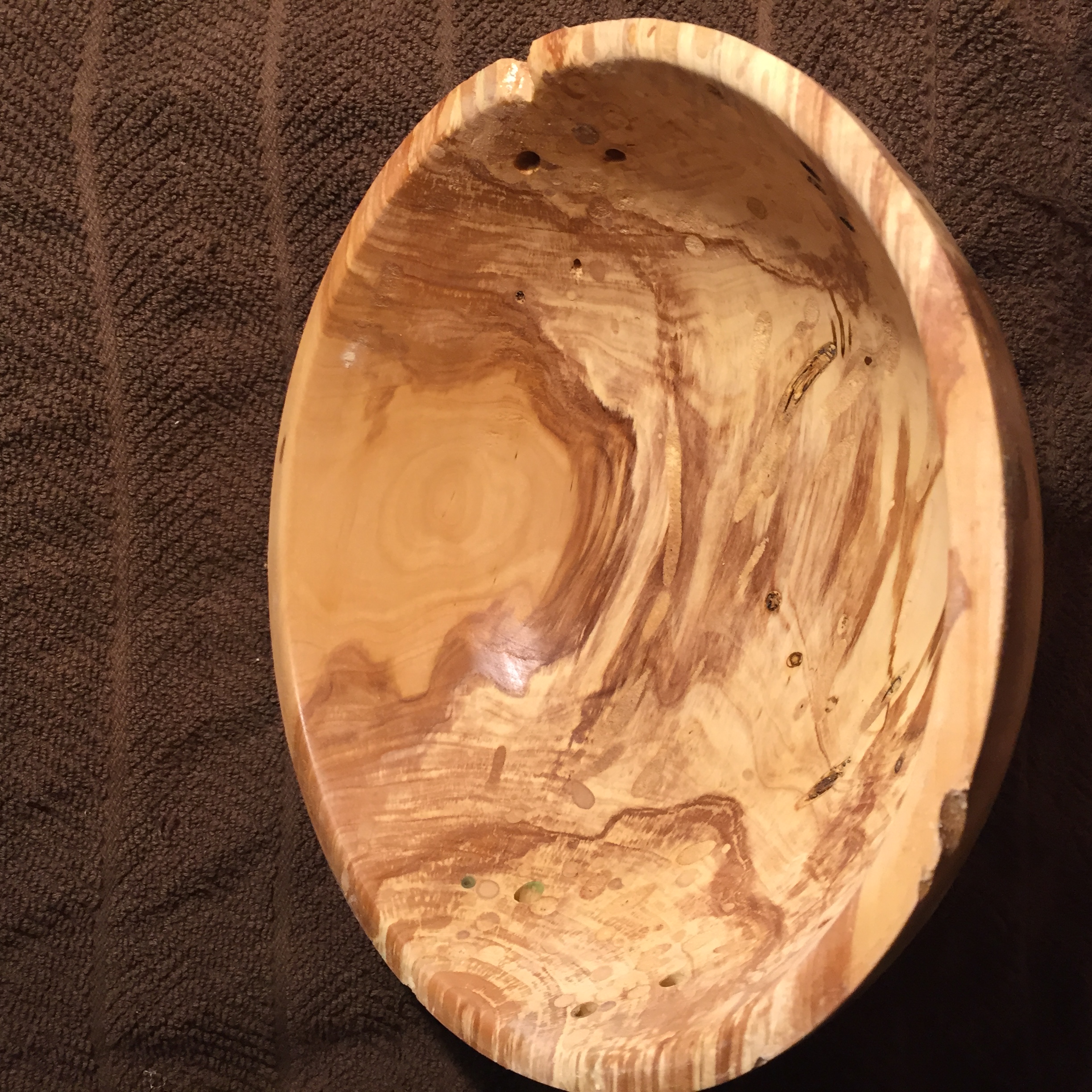 Here are two pictures of the second bowl. This one was from the same tree, but further away from the woodpecker attack, so the wood isn’t nearly as bad and didn’t require as much time in the tank to stabilize. Top view: