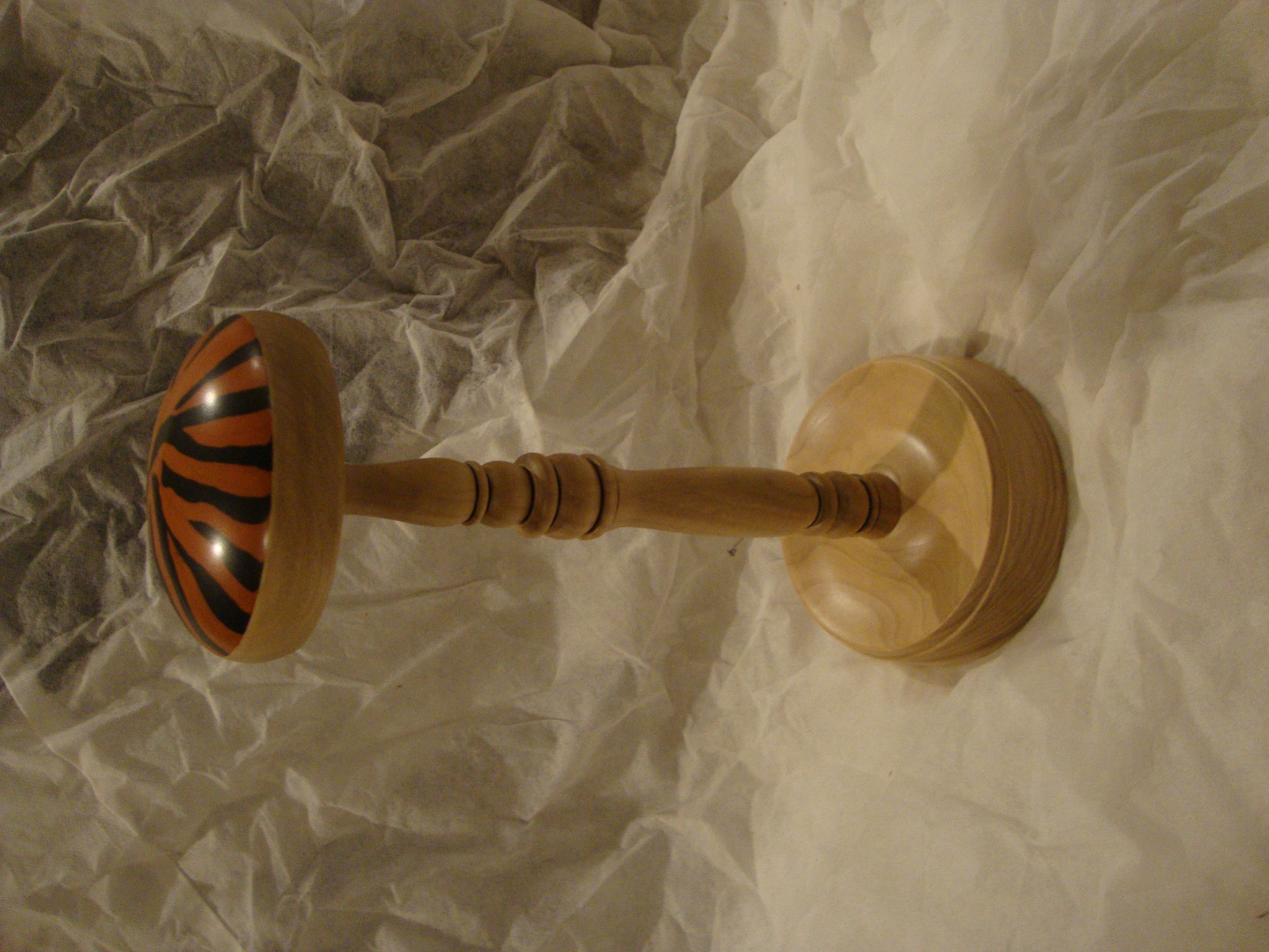 Most of the stands being made are “brown and round”, like a dome stuck on a stick, stuck in a circle. Very utilitarian. I figure as long as the person is going to have to stare at it, I might as well try to do something to make it worth looking at. I made the top out of colored epoxy clay, so it wouldn’t be damaged by the sweat, heat and moisture that comes from the wigs. The chemo apparently does horrible things to the women, sweating profusely being one of them, so you have to be very careful with the finish that you use. I also added a little indentation in the bottom to hold ear rings, necklaces, rings, or anything else that needs to be held.