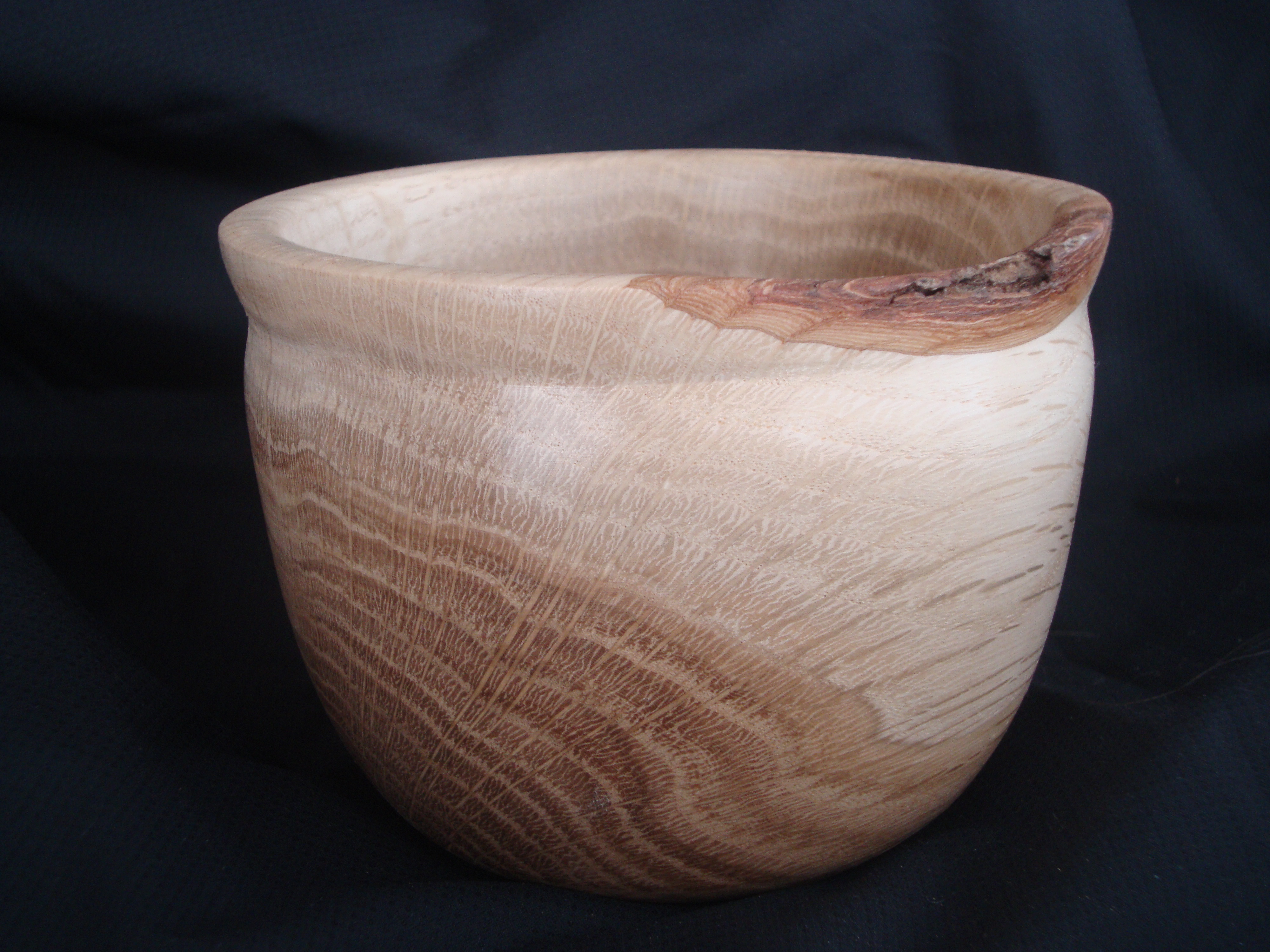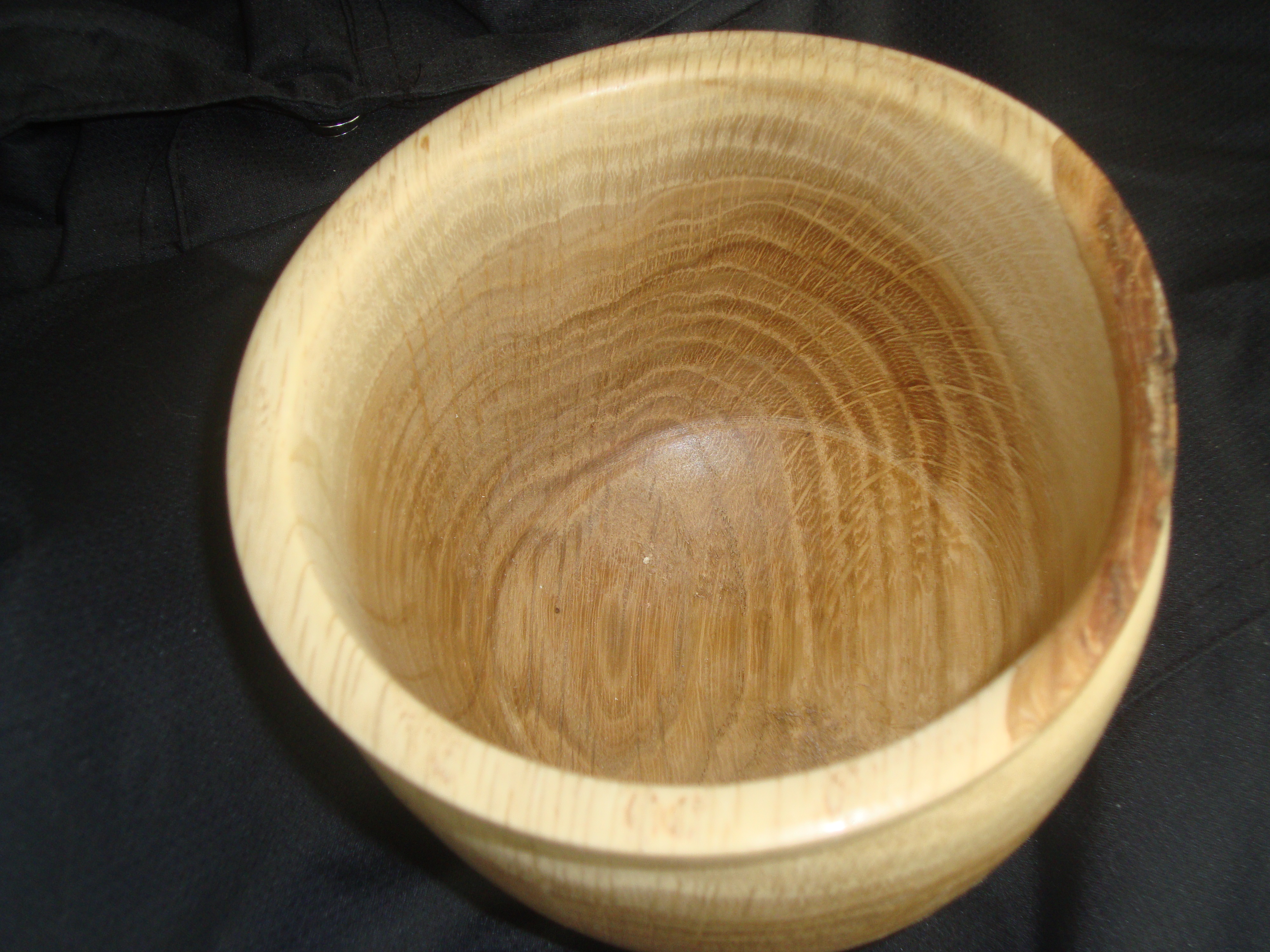 Lately, I’ve been researching different methods I could use to sharped my tools. I already have system that will put a consistent, repeatable, bevel on the tools, but reading articles about changing the angle of the grind got me thinking. To test out the impact of the changes, I’d need a piece of wood to practice on, so I started looking around. I finally found a chunk of white oak that had been kicked under the table at some point in the past and decided it would be my practice block. After awhile, I discovered there wasn’t really anything wrong with the way I had been sharpening the tools, and the “new and improved” methods really didn’t work any better than what I was used to. By the time I had this epiphany, There was already a rough shape of a small bowl, so I finished it up. It’s only about 4 inches high by 4 inches wide…