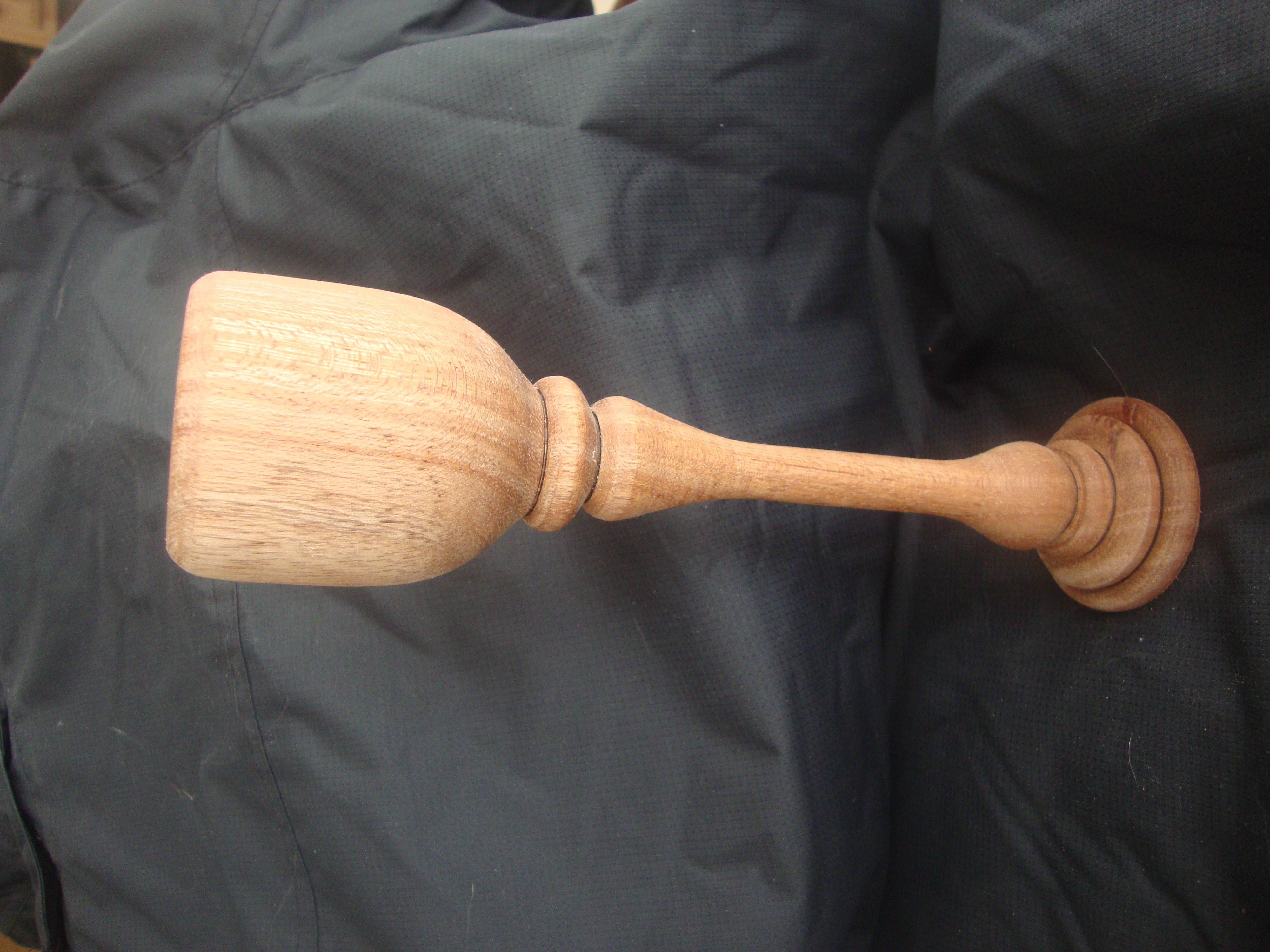 Since I’m supposed to help teach a class this next week on spindle turning, I figured I’d better get in a little practice. Here’s the result. The stem is MUCH, MUCH thicker than I would have normally made it, but since I’m taking it as a piece to be shown and handled, I left it a little thicker. If the wood wasn’t “exotic”, this would definitely be in the “destroy all evidence” burn pile.