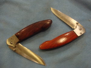 My son used to have a knife, but it was apparently “lost” as his mother cleaned out his room. (That’s a whole different story that I may put in the off-topic blog.) For his 17 birthday, I bought two knife kits and we made a pocket knifes: one for him, one for me. When we sent to the shop to select the wood that we’d use, I told him he could use anything in the shop that wasn’t already being used in a project. He went straight for the “special reserve” pile and pulled out a piece of purpleheart that I had been saving. The kid has taste! The one of the left is the one that Quintin made, but the purpleheart never really got all that purple, instead it became a dark brown color. I suspect it had something to do with the epoxy we used to secure the wood to the handles, but that’s just a guess. His is on the left. Mine’s on the right, made from bloodwood (also from the special reserve pile). Not too shabby for a first attempt!